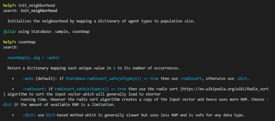 Use the '?' sign to get information about a function or an object - similar to R. Here's an example on the function we have previously defined and countmap which we will use later on in the tutorial.